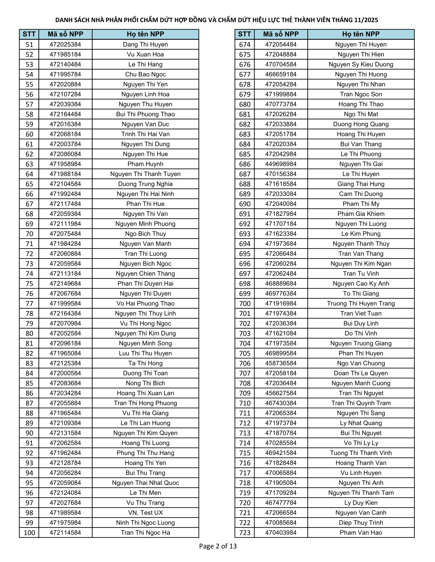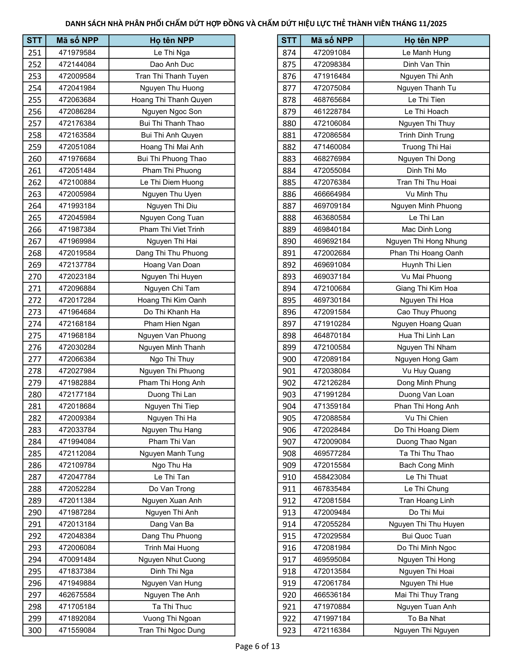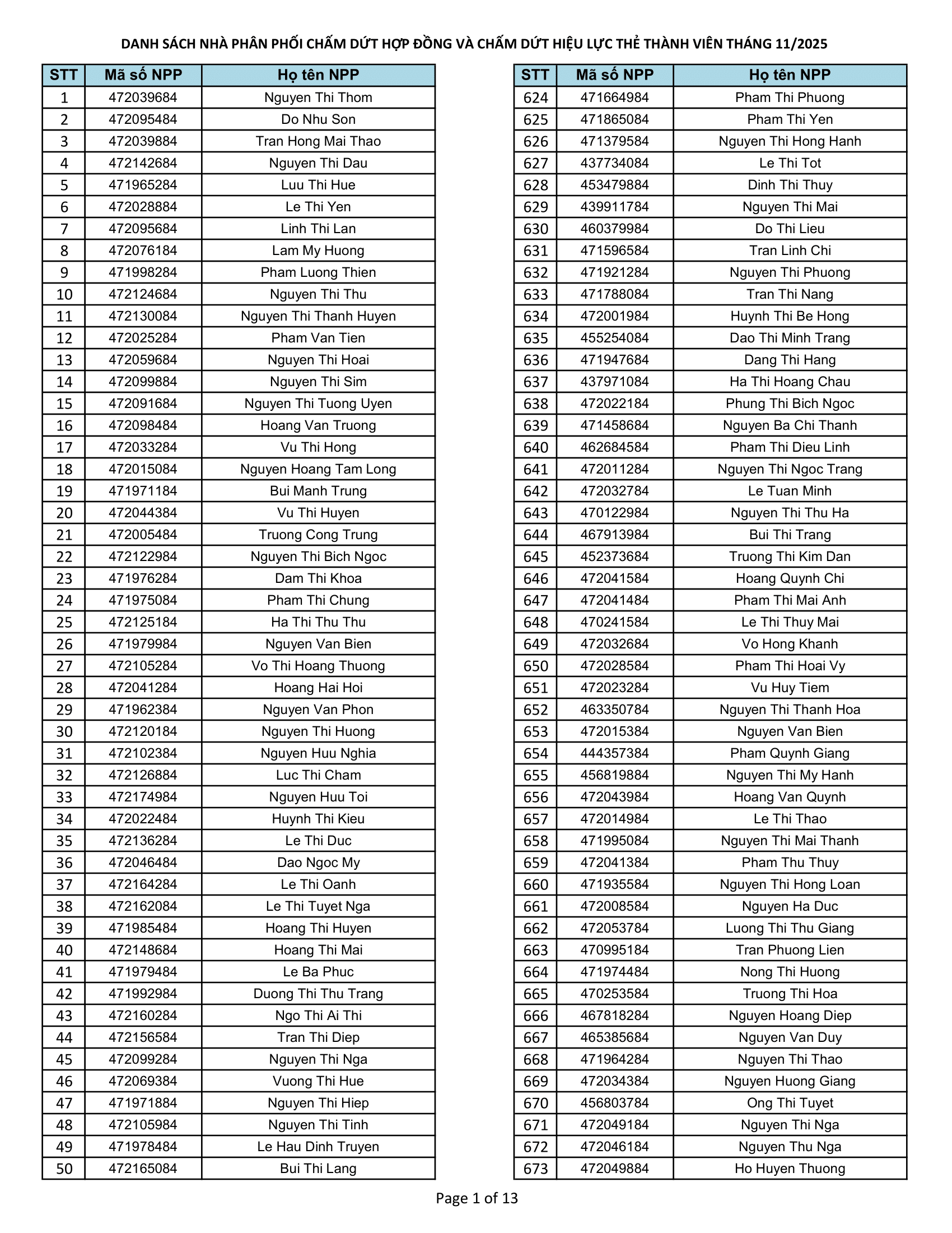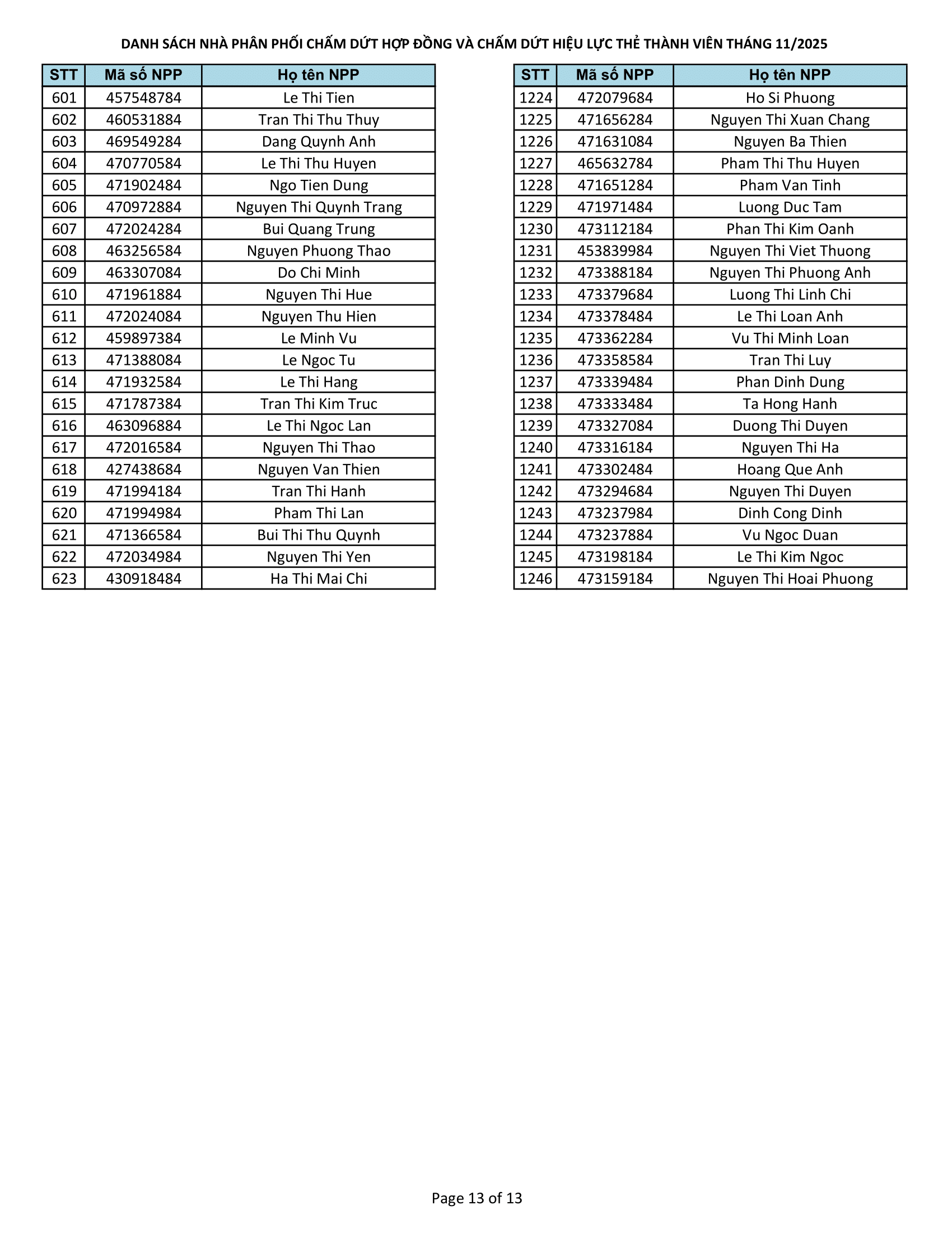 Về việc: Danh sách chấm dứt hợp đồng Nhà Phân Phối và Chấm dứt hiệu lực thẻ thành viên tháng 11-2025