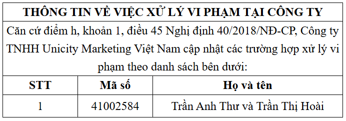 Căn cứ điểm h, khoản 1, điều 45 Nghị định 40/2018/NĐ-CP, Công ty TNHH Unicity Marketing Việt Nam cập nhật các trường hợp xử lý vi phạm theo danh sách bên dưới:
