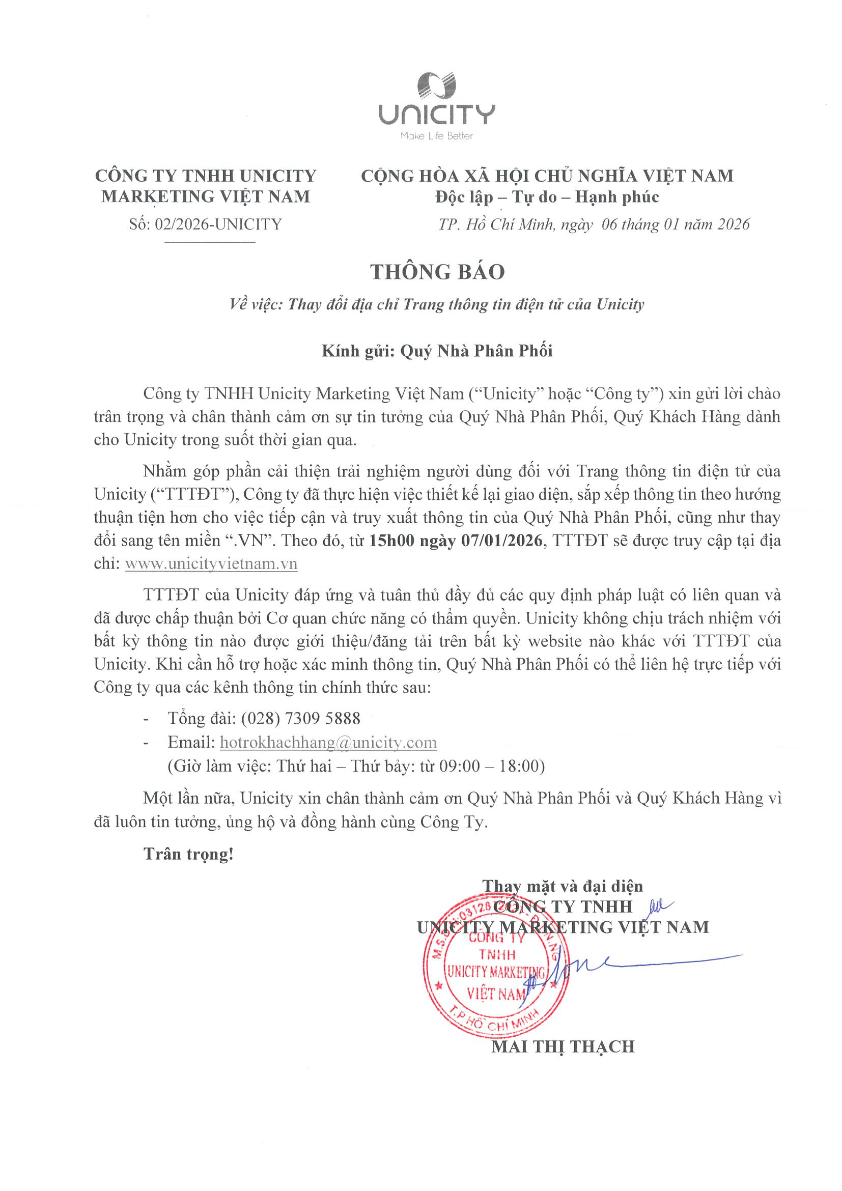 Thông báo về việc thay đổi địa chỉ Trang thông tin điện tử của Unicity