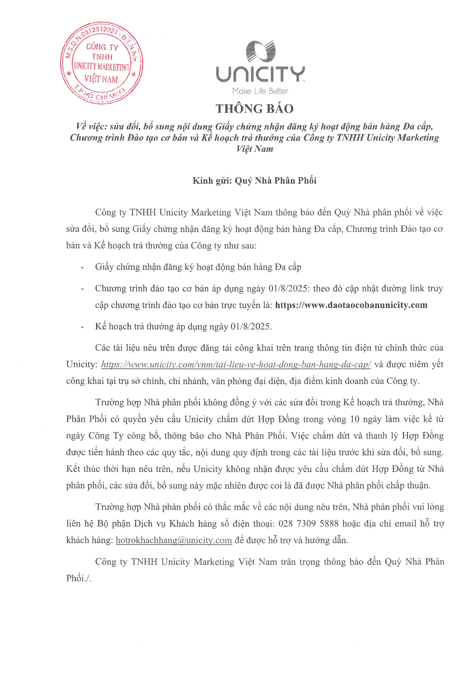 Công ty TNHH Unicity Marketing Việt Nam trân trọng thông báo đến Quý Nhà Phân Phối./.