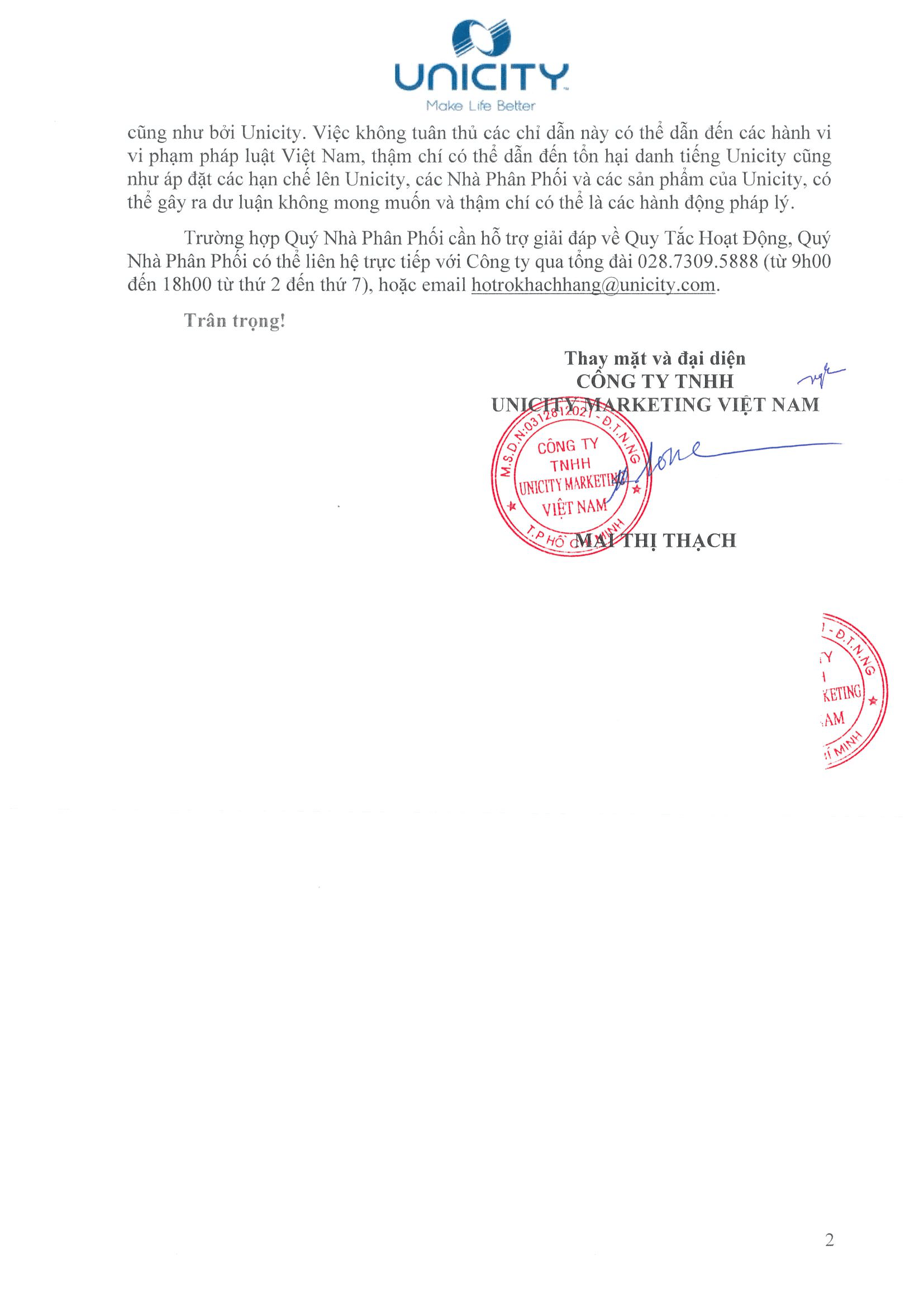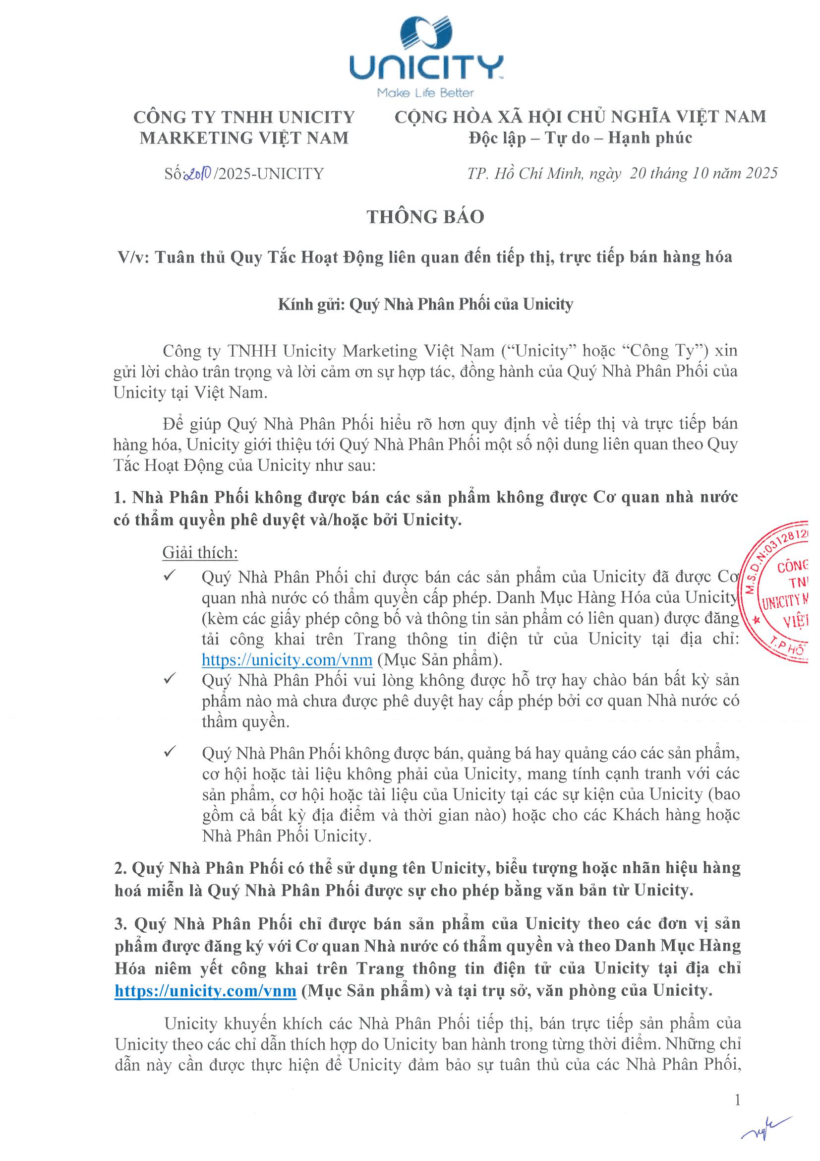 Công ty TNHH Unicity Marketing Việt Nam trân trọng thông báo đến Quý Nhà Phân Phối./.